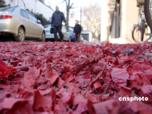 2月13日是正月初七,苏州许多商家在节后营业第一天燃放“开门炮”,许多街道上一地纸屑。 中新社发 王建康 摄
