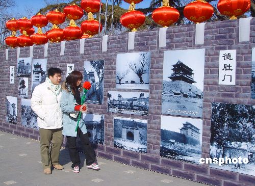 2月13日,北京龙潭湖庙会举办的最后一天,园中展出的老城门照片吸引了众多市民的目光。中新社发 玉龙 摄
