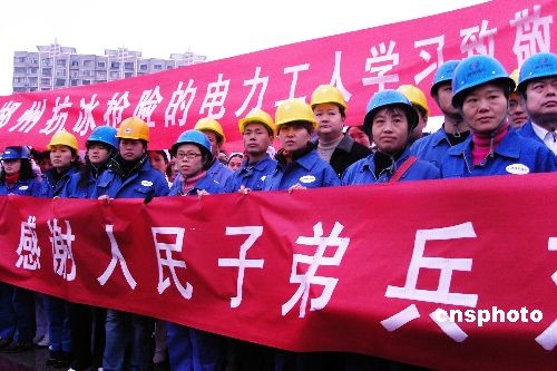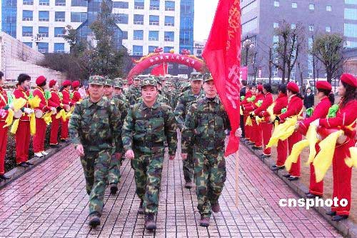 2月25日下午,湖南省郴州市委、市政府、郴州军分区举行盛大仪式,欢送支援郴州抗冰救灾的部队官兵离开郴州,数万市民冒着细雨前往郴州五岭广场为子弟兵送行。中新社发 贺茂峰 摄