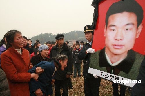 事件回放:2008年1月中旬,湖南省遭遇了50年罕见的冰雪灾害,电力设施遭到严重摧毁,罗海文、罗长明、周景华志愿加入到抗冰保电抢险队伍。2008年1月26日,他们冒着严寒、不顾危险在长沙电厂——沙坪变电站500千伏输电线路上进行人工除冰,因41号、43号、44号铁塔不堪冰雪重负,相继发生坍塌,他们3人随即从高空坠落,壮烈牺牲。三位英雄壮烈牺牲后,湖南省开展向三位烈士学习的活动。湖南省总工会追授他们为“湖南省五一劳动奖章”荣誉称号;共青团湖南省委追授他们为“湖南省五四青年奖章标兵”。1月29日上午,国务院总理温家宝亲临长沙指挥抗灾工作时,亲自看望慰问了三位英烈家属。中新社发 郭国权 摄