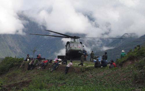 首批救援直升机14日上午成功降落此次地震震中汶川县城,新华社记者 徐壮志 摄。