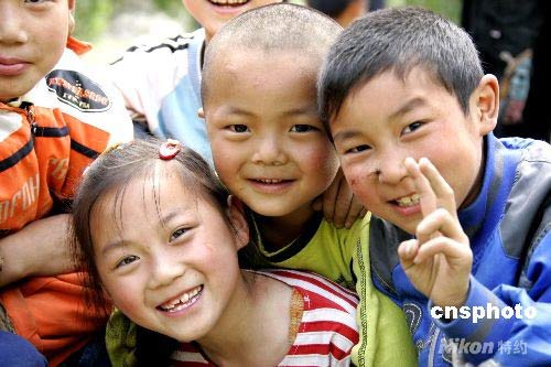 5月22日,四川汶川绵池镇灾区的儿童面对镜头露出久违笑脸。连日来,受地震影响的受灾民众在武警官兵等热心人士的共同努力下,已陆续得到妥善安置。中新社发 贲道春 摄