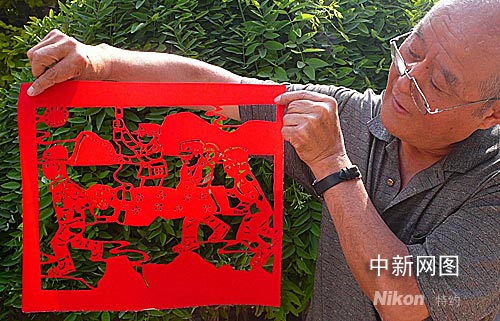 6月5日,山西省侯马市民间老艺人李传源展示他创作的“爱在人间”抗震救灾系列剪纸作品。汶川地震发生后,老人用两周的时间构思创作了15幅系列剪纸作品,其中“帐篷学校开学了!”、“争分夺秒 救死扶伤”、“孤儿不孤”、“自力更生 重建家园”等作品,再现了大灾面前更有人间真情的动人场景。表达了一个剪纸艺人对灾区人民的牵挂和重建家园的良好祝愿。作者:冯文芳