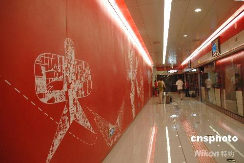 机场快轨的始发站——东直门站的站内装潢以中国红为主色调,并印有北京传统手工制品风筝的图案,喜气洋洋迎接国内外客人,迎接北京奥运。中新社发 蔺佳 摄