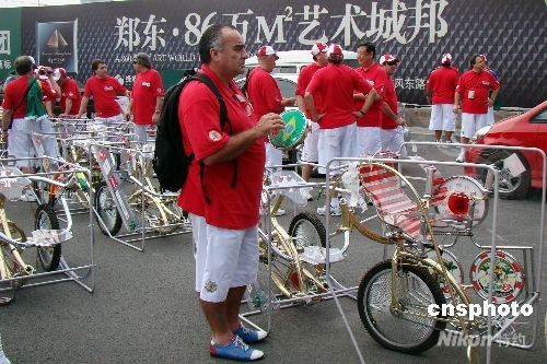 8月3日下午,巴西友人携长8米的连体自行车在郑州表演,为中国加油,为奥运助威。当日,应河南省外侨办邀请,巴西圣卡塔琳娜州副州长莱奥内尔·阿尔坎杰罗帕万,率该州代表团一行26人访问河南。据悉,代表团一行沿途还将到香港、上海、北京等地进行表演。中新社发 李冰 摄