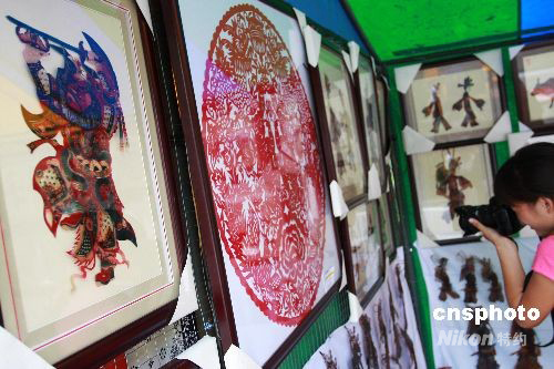 8月11日,为期10天的首届北京民族文化艺术博览园在地坛公园举行。民博园将集中展示181项民族艺术精品、80余项非物质文化遗产、21家北京老字号等,让游客领略北京深厚的历史文化底蕴和中华民族传统文化的魅力。图为中国民间皮影和剪纸艺术亮相北京民族文化艺术博览园吸引市民拍照留念。中新社发 郑雄增 摄