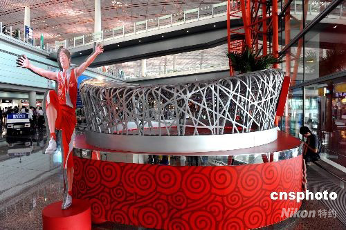 8月12日,北京首都机场T3航站楼搭建一处类似于“鸟巢”体育馆的景观,欢迎奥运宾朋。 中新社发 廖攀 摄