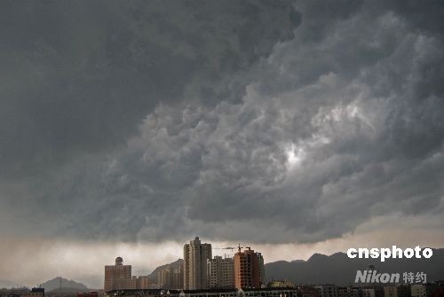 2008年8月15日14时许,浙江苍南县突然乌云四起,瞬间盖住了整个苍南县城,随后风雨雷电交加。中新社发 张炳钩 摄