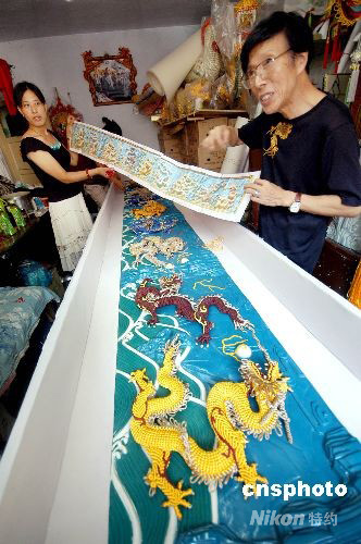 8月15日,沈阳民间艺人方振生经过30个月的时间,用了3600个中国结创作出结绳雕作品《九龙壁》亮相。《九龙壁》壁高0.68米,厚0.2米,面宽2.42米,按照北京故宫《九龙壁》制作而成。九条蟠龙分别遵循民俗传统工艺,九条蟠龙飞舞腾翔于波涛云气之间,其气势雄劲栩栩如生呼之欲出。目前作者正在申请世界吉尼斯纪录。中新社发 文契 摄