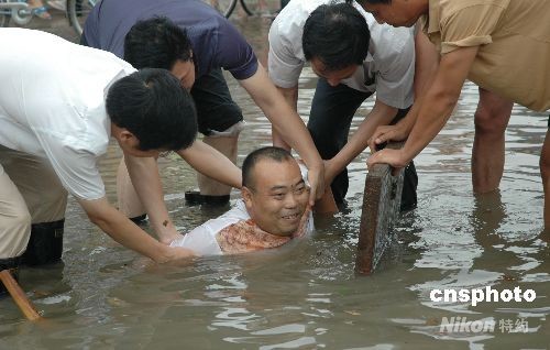 图:江苏暴雨 工作人员身体疏通下水道