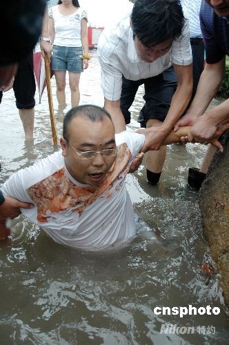 8月17日,大暴雨袭击江苏部分地区,睢宁县多处路段严重积水,有关部门及时组织排水。图为大雨过后城管工作人员用身体疏通下水道。中新社发 洪星 摄