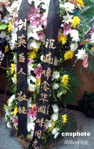 8月22日,解放军305医院设置悼念原中共中央主席华国锋的灵堂,社会各界人士前往悼念。据悉,将从当天起进行3天的公众悼念活动。华国锋因病医治无效于8月20日12时50分在北京逝世,享年87岁。图为叶帅后人所送花圈。中新社发 韩凯 摄