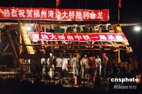 8月26日,经过2个多小时的混凝土浇注,福建省目前最长的跨江大桥——福州湾边大桥实现合龙贯通。这座福州西南出城交通枢纽桥梁全长3450米,宽34米,6车道,全线按高速公路标准建设。中新社发 郑祚声 摄