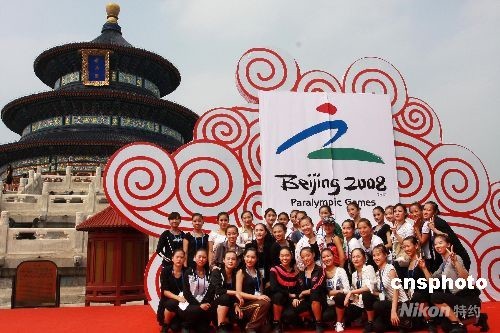 8月27日下午,工人们在北京天坛布置采火仪式现场。28日上午,北京残奥会采火仪式将在天坛举行。中新社发 郑雄增 摄