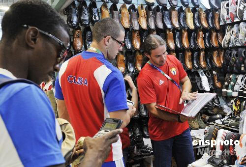9月3日,北京秀水市场,继北京奥运会各国政要和运动员“疯狂购物”后,又迎来新一批“奥运军团”——残奥会官员、运动员。图为古巴残奥运动员们手拿计算器和样品册在定制鞋子。中新社发 王宇婷 摄