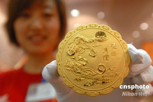 9月3日,辽宁省沈阳市一黄金商店内,服务人员展示迎接中秋佳节的黄金月饼。该月饼用24K黄金制作,售价在10000元左右。中新社发 孙海 摄