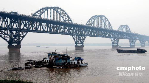 9月5日14:00左右,受长江中上游地区强降雨影响,长江九江段迎来今年入汛以来最高水位。据监测,长江九江水文站水位达18.2米,流量每秒46300立方米,目前水位已超过设防水位1.2米,并仍呈上涨态势。湖口水位达到17.44米,湖口站已出现长江水道灌鄱阳湖的现象。图为长江九江段出现的高水位,几乎将九江长江大桥桥墩淹没。中新社发 胡国林 摄