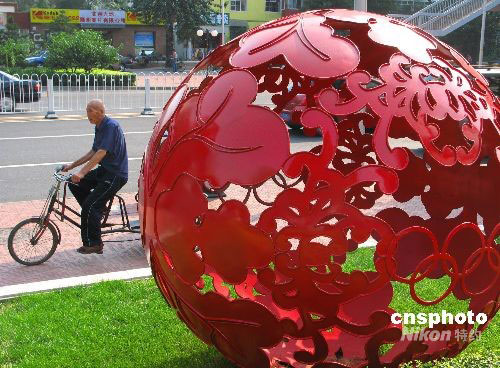 9月5日,北京天气晴好,一位骑三轮车的老人从翠微路街头“红月亮绣球”雕塑前路过,别有一番景象。这尊雕像首先将迎来北京残奥会的召开,及14日中国传统佳节--中秋节的来到。中新社发 邹宪 摄