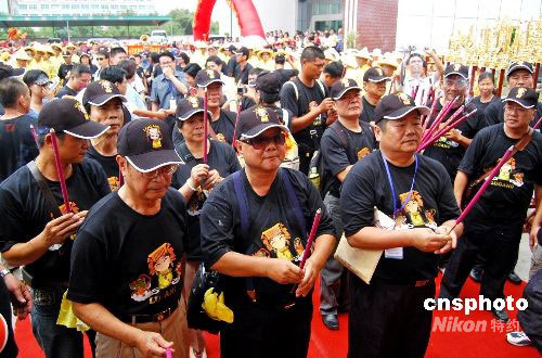 九月五日中午,台湾鹿港天后宫进香团的三百多名妈祖信众由金门分两批乘船抵达泉州石井对台客运码头,进行为期五天的谒祖进香活动。 这是鹿港天后宫开基妈祖一百九十一年后重回大陆谒祖。据介绍,鹿港天后宫妈祖,是三百多年前施琅将军从福建引请到台湾的。曾于清嘉庆二十二年(一八一七年)在鹿港八郊人士护送回湄洲祖庙谒祖,迄今已一百九十一年,这次再回祖庙会香,见证两岸妈祖神缘。中新社发 傅丹丹 摄