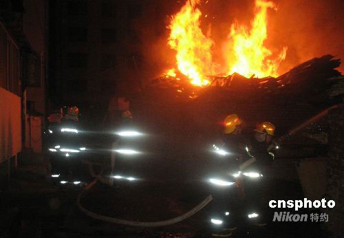 9月9日,黑龙江省哈尔滨市南岗区西大直街334号院内堆放木板等杂物的仓房起火,居住在仓房附近楼内的居民安全撤出,消防战士奋战到5时30分左右,终于控制火势。此次火灾没有造成人员伤亡,火灾起因还在进一步调查中。中新社发 王忠言 摄