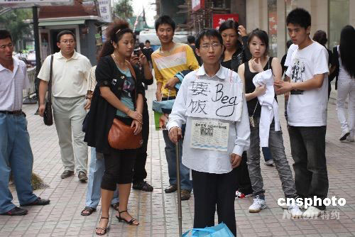 9月9日,一名特别的“乞丐”在哈尔滨市南岗区果戈里大街乞讨。记者了解到,“乞丐”名叫夏海波,1982年9月15日出生,高二时因病辍学,治病花光了家里的钱,但是病还是没有医治好。2006年他离开家乡,试图找份工作养活自己,但因为自身残疾没有找到合适的工作。生活使他走上街头,试图靠乞讨的钱治病延缓病情发展。夏海波开了博客,将每天的感受记录在博客里。他在博客里公开了自己的银行帐号,以便接受网友的捐助。中新社发 王忠言 摄
