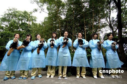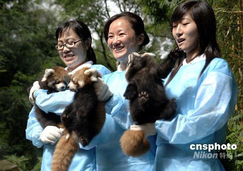 9月10日,福州大熊猫研究中心工作人员向媒体展示今年刚刚繁殖成功的八只小熊猫。福州大熊猫研究中心自2004年8月12日一只叫“山妹”的小熊猫一举产下三胞胎并饲养成活以来,五年间,每年都有三胞胎幼仔成活,甚至三代同堂。今年又产下两胎三胞胎、一胎双胞胎、两胎单胞胎共五胎10只幼仔,成活8只。中新社发 王东明 摄