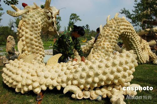 9月10日,在江苏扬州瘦西湖万花园内,由一万多顶小草帽拼出的“神州巨龙”景观制作完成。“巨龙”身长近30米,直径1.2米,它将在即将举行的第二届中国扬州世界运河名城博览会暨运河名城专家论坛期间正式对外亮相。中新社发 张丙涛 摄