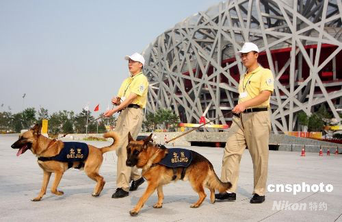 2008年9月17日,北京残奥会闭幕式即将开始,警方工作人员牵着多条防爆犬对“鸟巢”进行地毯式检查,保障残奥会顺利闭幕。中新社发 吴芒子 摄