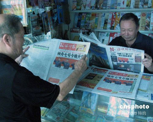 9月25日,福州市民通过阅读国内多家报纸在头版刊登“神七”飞船于当日晚间择机发射的消息,关注3位“神七”航天员。中新社发 刘可耕 摄