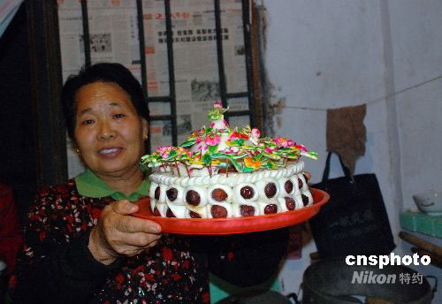 9月25日下午, 在山西运城市盐湖区安邑街道办事处杨家卓村景海鹏的老家,前来到贺喜的亲戚朋友和当地政府代表络绎不绝。图为景海鹏的母亲王珍玲特意为景海鹏做的“神舟七号”形状的枣糕。中新社发 张雷杰 摄
