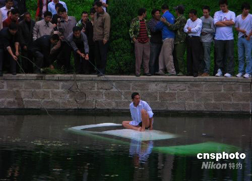 9月25日,北京一辆私家轿车在车速极快的情况下撞破两个护栏,掉进京密引水渠之中。所幸没有造成人员伤亡。有路人帮助事主打捞汽车,用尼龙绳将车拉近河边,等待大型吊车的到来。中新社发 邹宪 摄