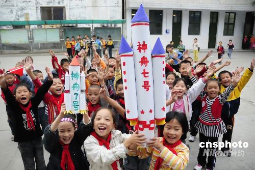 9月25日下午,河南南阳市第十八小学的小学生在欢呼庆祝我国的“神七”即将发射。当天,“神七”任务总指挥长常万全的家乡——南阳市卧龙区在以各种方式祝福“神舟七号”飞船发射计划圆满成功。世界瞩目的“神舟七号”飞船将于当晚发射。中新社发 熊运彬 摄