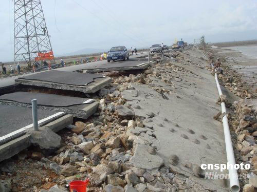 今年第14号强台风“黑格比”引发的风暴潮,把广东阳江海陵岛试验区总长约5公里、岛内通往外界的唯一陆上通道海陵大堤撕开了7个大缺口,大堤断成8截。顷刻之间,海陵岛顿成孤岛,岛内交通、电力、供水和通讯中断。目前,海陵岛内的10万居民仍被困在孤岛上,被冲垮的大堤尚在紧张抢修之中。中新社发 陈明 摄