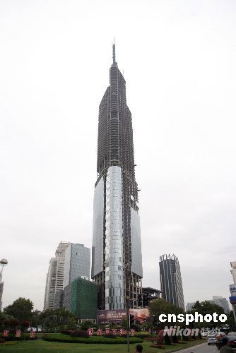 9月28日,江苏第一高楼——南京绿地广场紫峰大厦已完成封顶,一举攀上450米高点。位于南京市中心鼓楼地段的紫峰大厦总楼层89层,其高度在全世界已建成和在建的摩天大楼中位居第七。紫峰大厦2009年底建成后,将成为南京城市新地标建筑。中新社发 胡高华 摄