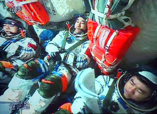 图:神舟七号返回在即航天员穿好舱内服