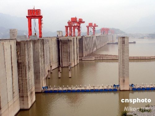 9月27日下午,据中国长江三峡工程总公司消息,经国务院批准,三峡工程从9月28日零点起试验性蓄水,三峡坝前水位由145米水位开始抬升,至10月6日左右攀高至156米,再根据实际蓄水情况经国务院审批看是否进一步提高水位至175米。中新社发 刘君凤 摄