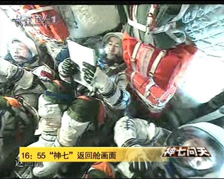 北京时间9月28日下午16时55分许,神舟七号三名航天员即将返回地球,他们已经穿好舱内航天服,神态安详平静。
