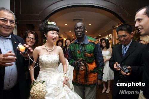 9月28日,参加“2008驻华使节和夫人中国才艺大赛”的外交官员们在天津参观始建于1863年利顺德大饭店时巧遇在酒店中举行婚礼的新娘,众多驻华使节纷纷相拥漂亮的中国新娘,争扮“新郎”与其合影,一时间中国新娘羞红的脸上洋溢着幸福笑颜。当日,由中国人民对外友好协会主办的“2008驻华使节和夫人中国才艺大赛”开幕仪式于9月底拉开帷幕。中新社发 杨可佳 摄
