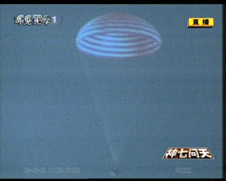 9月28日,神舟七号飞船返回舱主降落伞打开。
