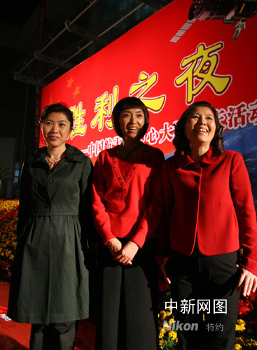 中国“神舟”七号载人航天飞行二十八日获得圆满成功,图为喜笑颜开的三位航天员妻子,从左至右分别是景海鹏的妻子张萍,翟志刚的妻子张淑静以及刘伯明的妻子张瑶。中新社记者 齐彬 摄