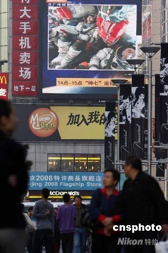 9月28日,神舟七号飞船返回舱顺利着陆,北京市民在街头观看现场直播。中新社发 杜洋 摄