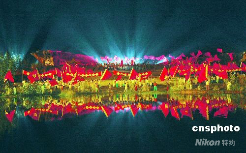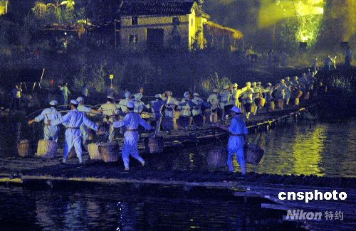 十月六日晚八时,江西省首个大型户外实景演出《井冈山》,再现当年八十年前红军挑粮上井冈山情景。这场《井冈山》的演出由近千名当地农民参演,采用一千多盏灯光、五万五千多平方米的舞台。中新社发 段长征 摄