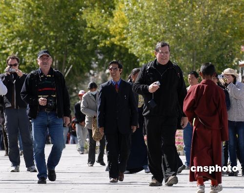 2008年10月12日,一组23人的德国团队在拉萨大昭寺广场观光游览,这是西藏在拉萨当雄“10.6”地震后,迎来的最大境外团队。 记者从西藏旅游总公司了解到,在拉萨当雄地震发生后,无论是旅行社接待的计划性入境旅游团队,还是接待的临时性入境旅游团队,都未受拉萨当雄县6.6级地震的影响。此外,记者还从拉萨市旅游局了解到,目前拉萨市各宾馆、酒店游客入住率也保持在30%左右,未受地震影响。中新社发 龙昊 摄