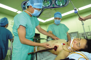 来到医院后王女士已经出现意识模糊,同时伴有剧烈的胸痛。胸外科主任张临友教授和副主任徐广全教授迅速组织相关科室人员会诊,争取快速摸清患者胸腔内的情况和钢筋对各器官造成的损伤。由于消防队员在切割钢筋时怕伤到王女士,所以切割点离伤口较远,造成留在体外的钢筋较长,伤者无法进入CT拍摄影像,给诊断带来了很大的困难。医生只得为王女士进行了胸部的X光片检查。依靠丰富的临床经验和X光片,医生判断王女士的肺组织已经损伤,必须立即开胸探查。