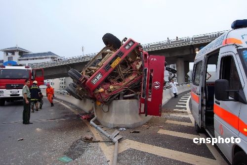 10月14日,广西南宁市青山立交桥上,由于车速过高,一辆拉土货车侧翻后被卡在立交桥上,车上满载的泥土全部从桥上倾倒到桥下,司机被卡在驾驶室内,命悬一线。事故发生后,当地公安、消防、120急救人员迅速赶到事故现场进行施救。目前,交警部门正对此事故做进一步调查处理。中新社发 牛书培 摄