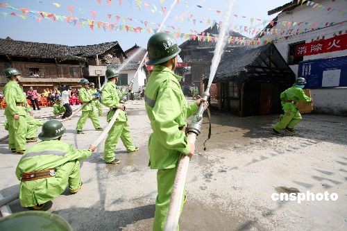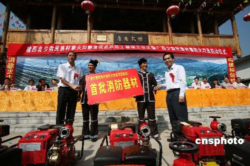 十月十四日,斥资八亿两千万元人民币的“桂西北少数民族村寨防火改造工程”在广西桂林启动,该工程分三年实施,将惠及十三多万户人家,五十九万少数民族民众。广西西北地区居住着苗、侗、瑶、仫佬等民族,这些少数民族有聚居习俗,几十户人家连成一片,且其房屋均为清一色木板房,导致火灾频发。中新社发 周华平 摄