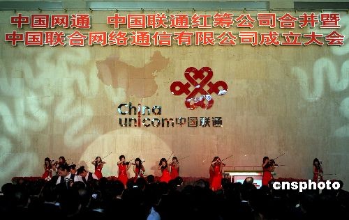 10月15日,中国网通、中国联通红筹公司成功合并,中国联合网络通信有限公司在北京正式成立。中新社发 张宇 摄