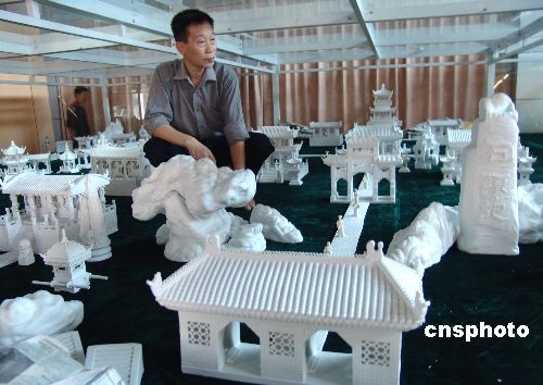 近日,世界上最大的瓷器群雕《大观园》在江西省景德镇全部完工。景德镇陶艺家罗冬根用6年的时间,制作出面积达80平方米,主件有300多件的瓷器群雕作品《大观园》。这部作品由建筑、园林、山水、民俗等部分组成,采用高白泥涩胎瓷制成,取题于《红楼梦》大观园,取材于苏州园林和江南徽派建筑。中新社发 石卫明 摄