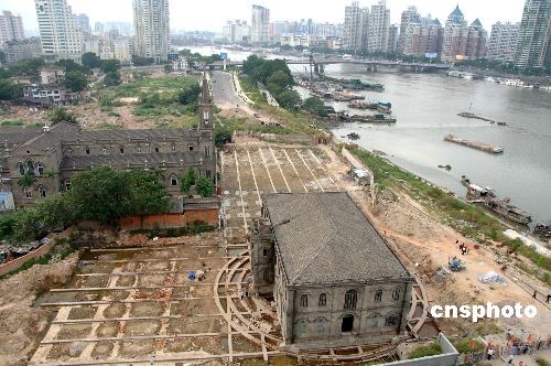 十月十五日,福州泛船浦教堂“神父楼”在向东平移八十点七米后,成功实现整体九十度逆时针转身。随后,施工单位又启动了再往南平移三十点七米(图中向左)的工程,南移后将着手修葺这座古建筑,尽量保持其原有的风格。中新社发 郑祚声 摄