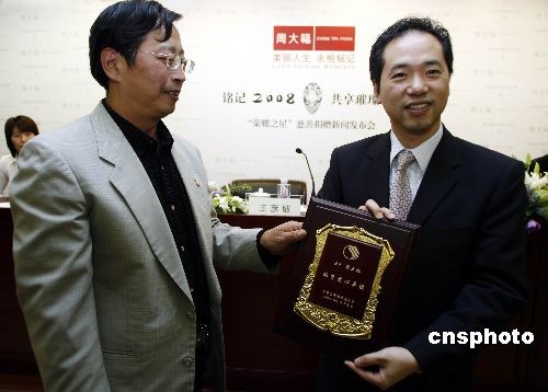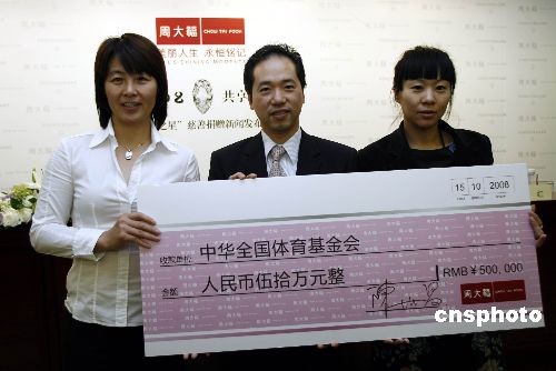 10月15日,著名珠宝品牌周大福在国家体育总局,举行名为“铭记2008,共享璀璨荣耀”的慈善捐赠新闻发布会,宣布将周大福Forevermark永恒印记“荣耀之星”的部分拍卖款项50万元人民币,捐助予“中华全国体育基金会(中国运动员委员会)”,这也是该委员会成立以来的首笔社会爱心团体的公益捐赠,此笔善款将用于支持该委员会开展体育公益工作,以号召更多企业关注和支持中国体育事业发展。周大福董事陈世昌先生、国家体育总局体育基金管理中心副主任、中华全国体育基金会副理事长王彦敏先生与著名运动员周继红女士(国家体育总局游泳运动管理中心副主任、运动员委员会主任委员),钱红女士(游坛“五朵金花”之一),高红(“铿锵玫瑰”之一、老国家女足守门员)均莅临现场。此前拍卖的Forevermark永恒印记“荣耀之星”27.16克拉梨形美钻,作为周大福专为2008年北京奥运会献礼之作,脱胎于重达70克拉的南非原产钻胚。更为珍贵之处在于在其台面上印记有源自周大福钻石原胚全球合作伙伴——世界最大的钻石原胚供应商戴比尔斯集团的“Forever mark”永恒印记”,其中特别珍选并全球唯一的“20080808”序列号码,特别铭记2008北京奥运,铭记中华体育世纪盛事。中新社发 杨可佳 摄